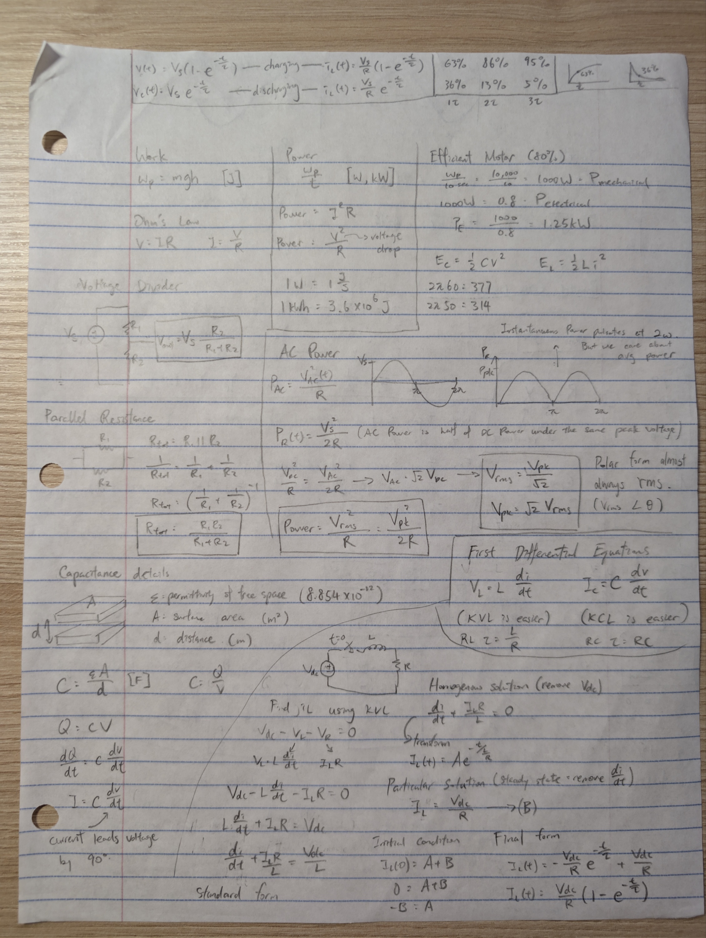 $$ \begin{aligned} \text{(Inductor)} \hspace{10pt} \boxed{V_L = L \frac{di}{dt}} &\hspace{20pt} \boxed{I_C = C \frac{dv}{dt}} \hspace{10pt} \text{(Capacitor)} \\[15pt] \tau = \frac{L}{R} &\hspace{20pt} \tau = RC \end{aligned} $$